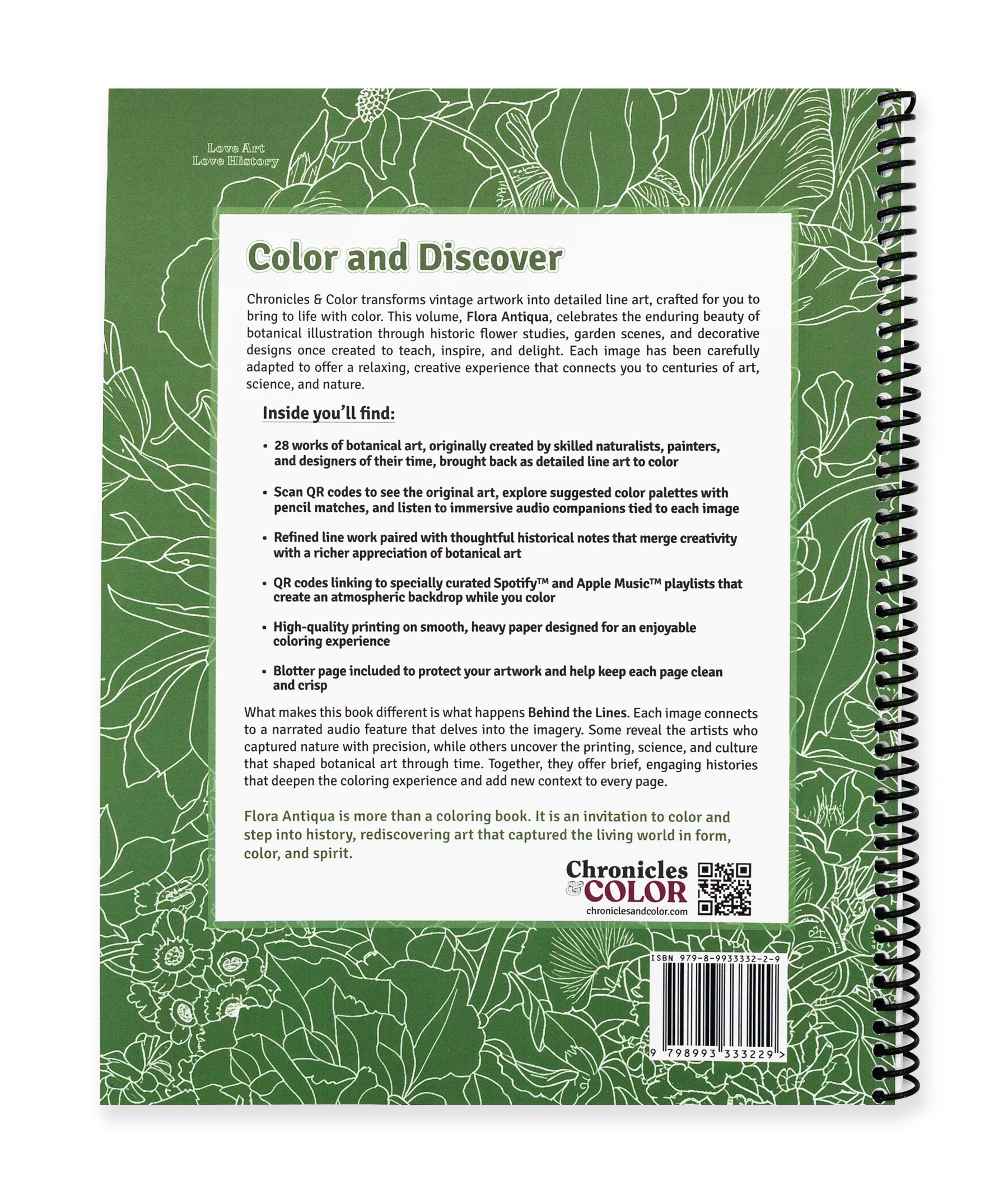 Every page includes a QR code unlocking additional context. View the original artwork, explore curated color palettes with pencil matches, and listen to narrated audio features that share the history, techniques, and naturalists behind each illustration. Companion playlists on Spotify™ and Apple Music™ create a calming backdrop while you color.