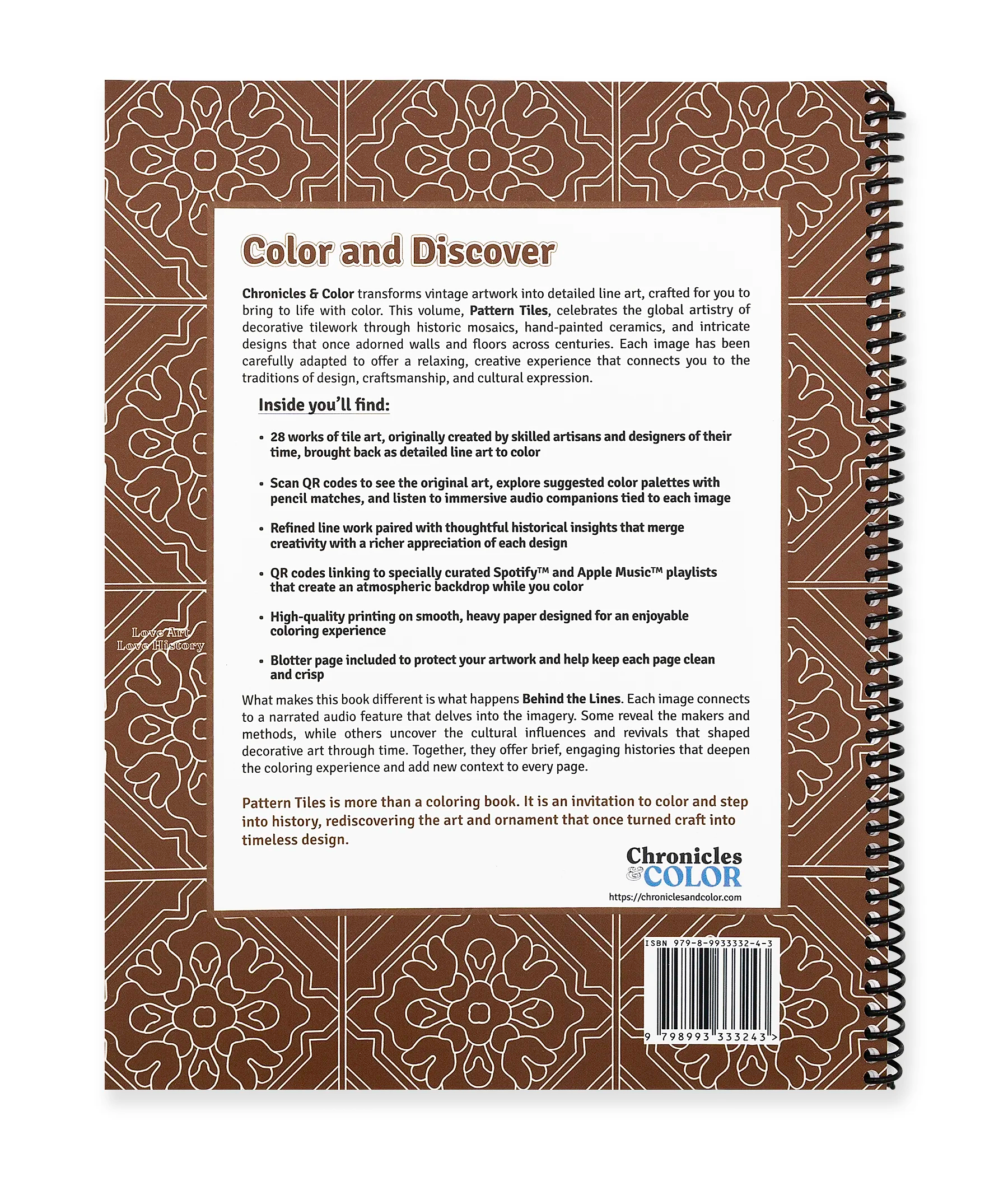 Every page includes a QR code unlocking additional context. View the original artwork, explore curated color palettes with pencil matches, and listen to narrated audio features that share the origins, materials, and artistic influences of each design. Companion playlists on Spotify™ and Apple Music™ offer a calming backdrop while you color.