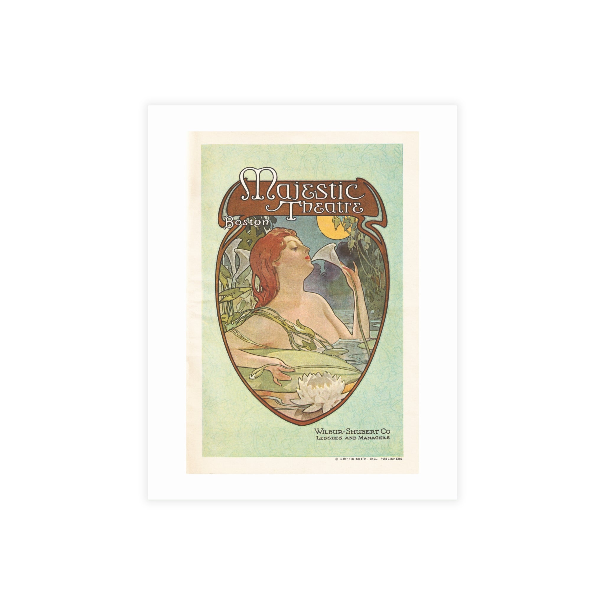 Celebrate Boston’s golden age of theatre with this elegant 1914 Art Nouveau playbill from the Cutler Majestic Theatre. Designed in the lavish European style that defined the early 20th century, this vintage artwork captures the glamour of a venue once illuminated by thousands of electric lights and adorned with gilded ornamentation. The flowing floral motifs and graceful typography reflect the international influence of Art Nouveau, blending artistry and performance in true turn-of-the-century fashion. Perfect for theatre lovers, history buffs, or collectors of vintage design.