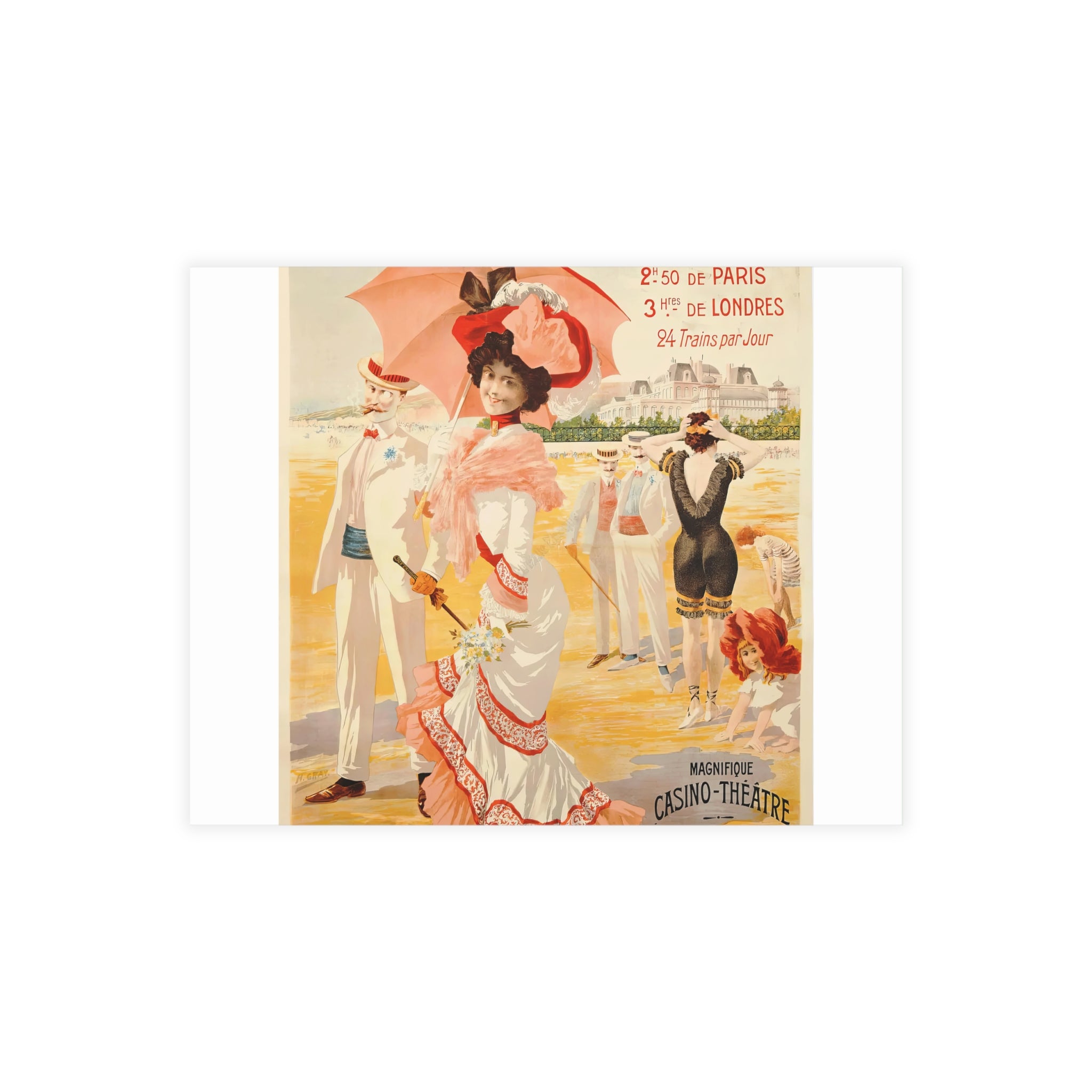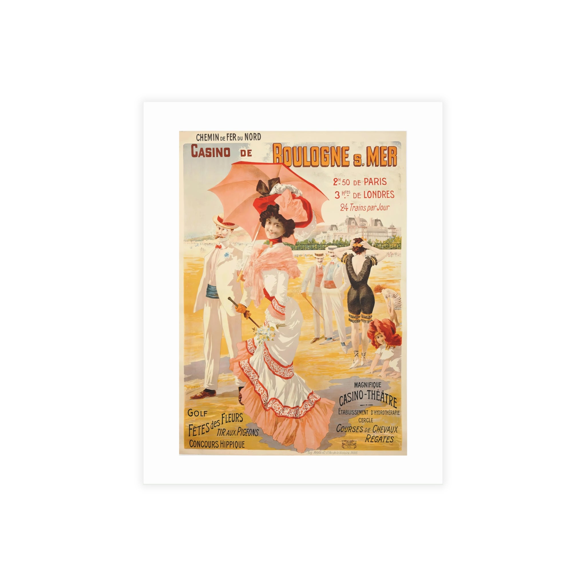 Make your correpondences special with this Belle Époque Boulogne-sur-Mer Vintage Artwork advertising the Chemin de fer du Nord. Henri Gray captures a glittering seaside promenade where parasols, summer dress, and the casino promise music, salt air, and elegant leisure. Gray’s lively color and flowing lines—alongside contemporaries like Mucha and Chéret—turn travel into a stylish invitation. A clever nod to an era when the journey was as glamorous as the destination.