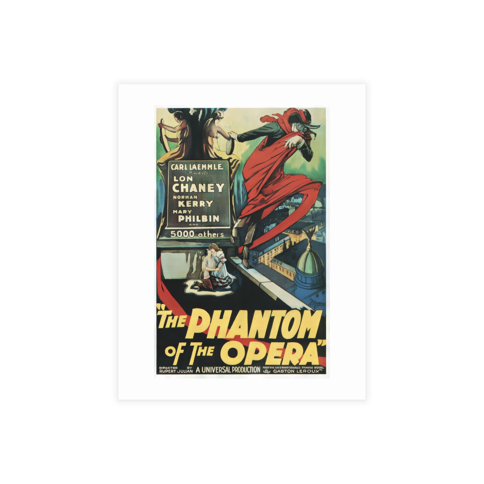 Step back into the golden age of cinema with Postcards featuring this Phantom of the Opera (1925) Vintage Poster Art Print. Inspired by Universal Pictures’ lavish silent film adaptation of Gaston Leroux’s gothic novel, this artwork captures the masked Phantom looming dramatically over Paris—a perfect blend of mystery, romance, and spectacle. Originally created to promote Lon Chaney’s legendary performance as the “Man of a Thousand Faces,” the poster embodies the grandeur of the Paris Opera House recreated on screen. While the artist remains unknown, its bold design has become one of the most iconic images of silent-era movie promotion. Ideal for film buffs, vintage art lovers, or anyone who appreciates timeless Hollywood style, this print adds a dash of classic drama to any room. Display it in your home theater, office, or gallery wall for a piece of cinematic history that never loses its haunting allure.