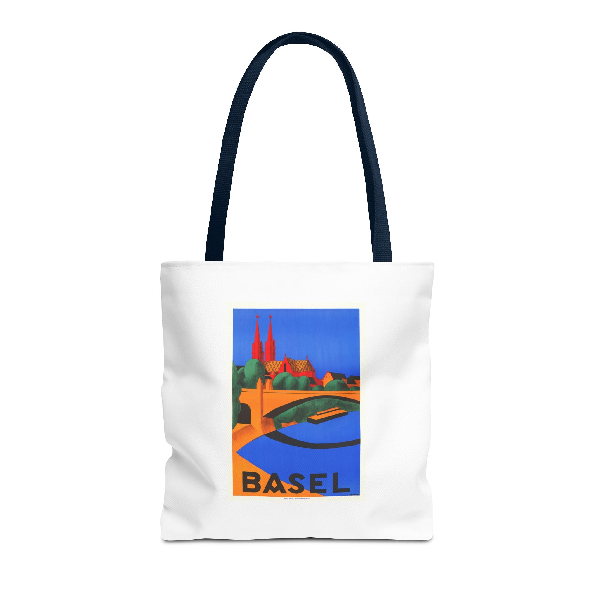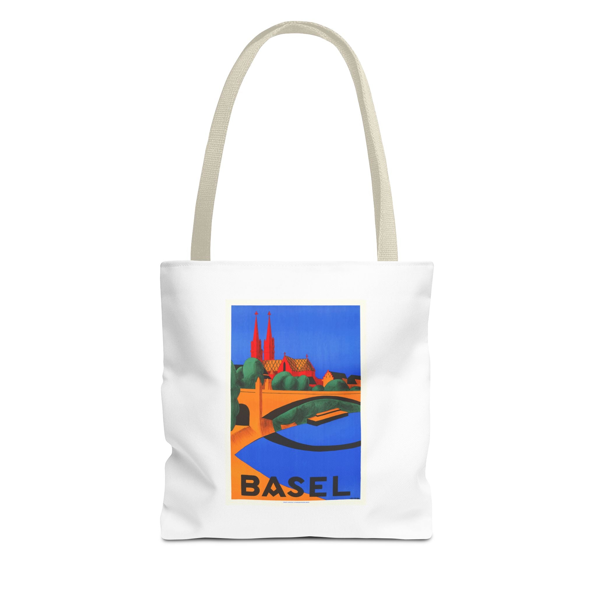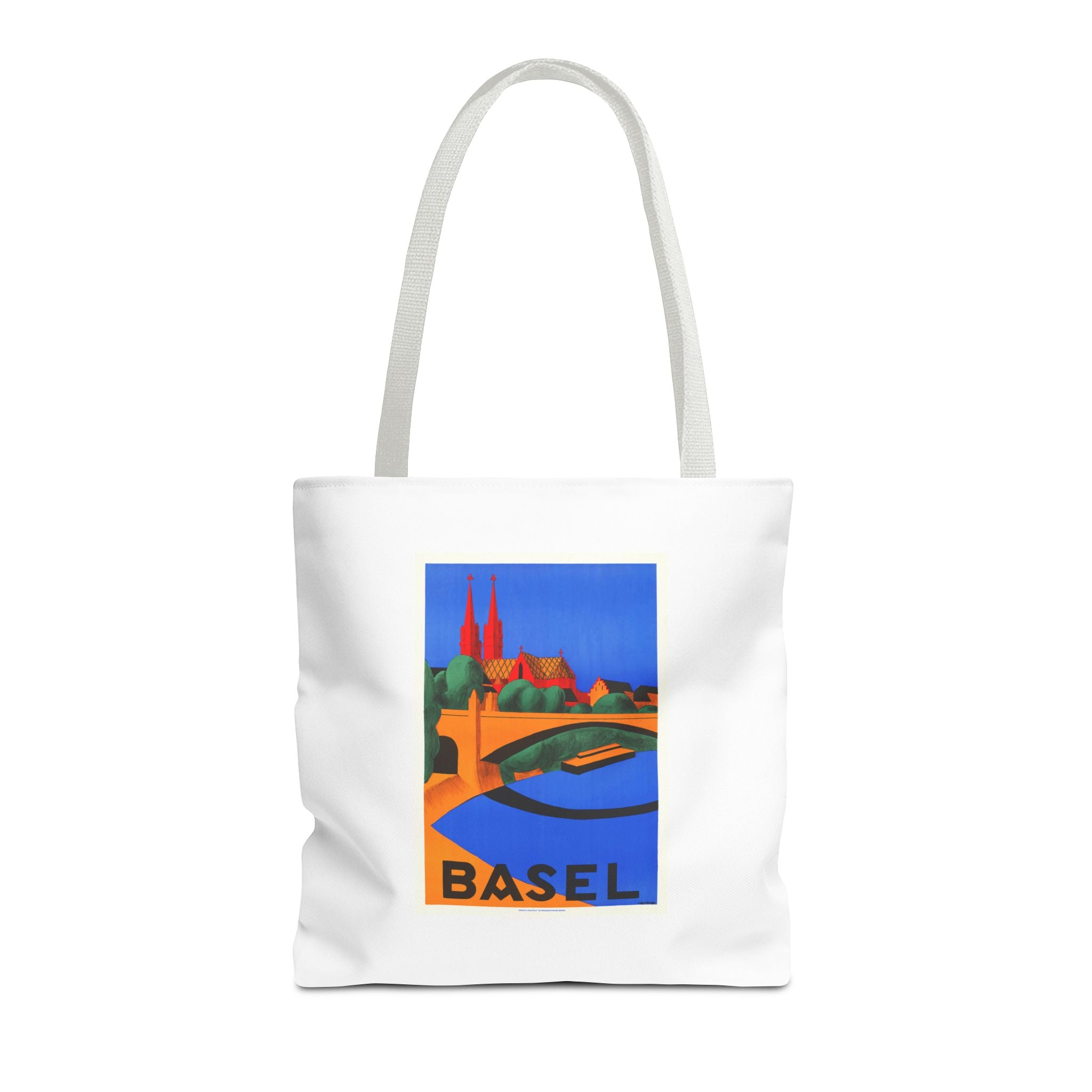 1927 lithograph by Hedwig Thoma captures Basel in bold color and clean shapes. The Rhine curves across the foreground toward the red-sandstone Basel Minster—its twin towers anchoring a skyline shaped by Romanesque roots and later Gothic rebuilds. Thoma’s simplified forms and strong contrasts reflect the Swiss poster-art style of the late 1920s, designed to catch the eye in bustling travel halls. The bridge hints at Basel’s life at the crossroads of Switzerland, France and Germany, where trade and culture mingle. This vintage artwork feels fresh and is perfect for lovers of travelers, vintatge art and European history.