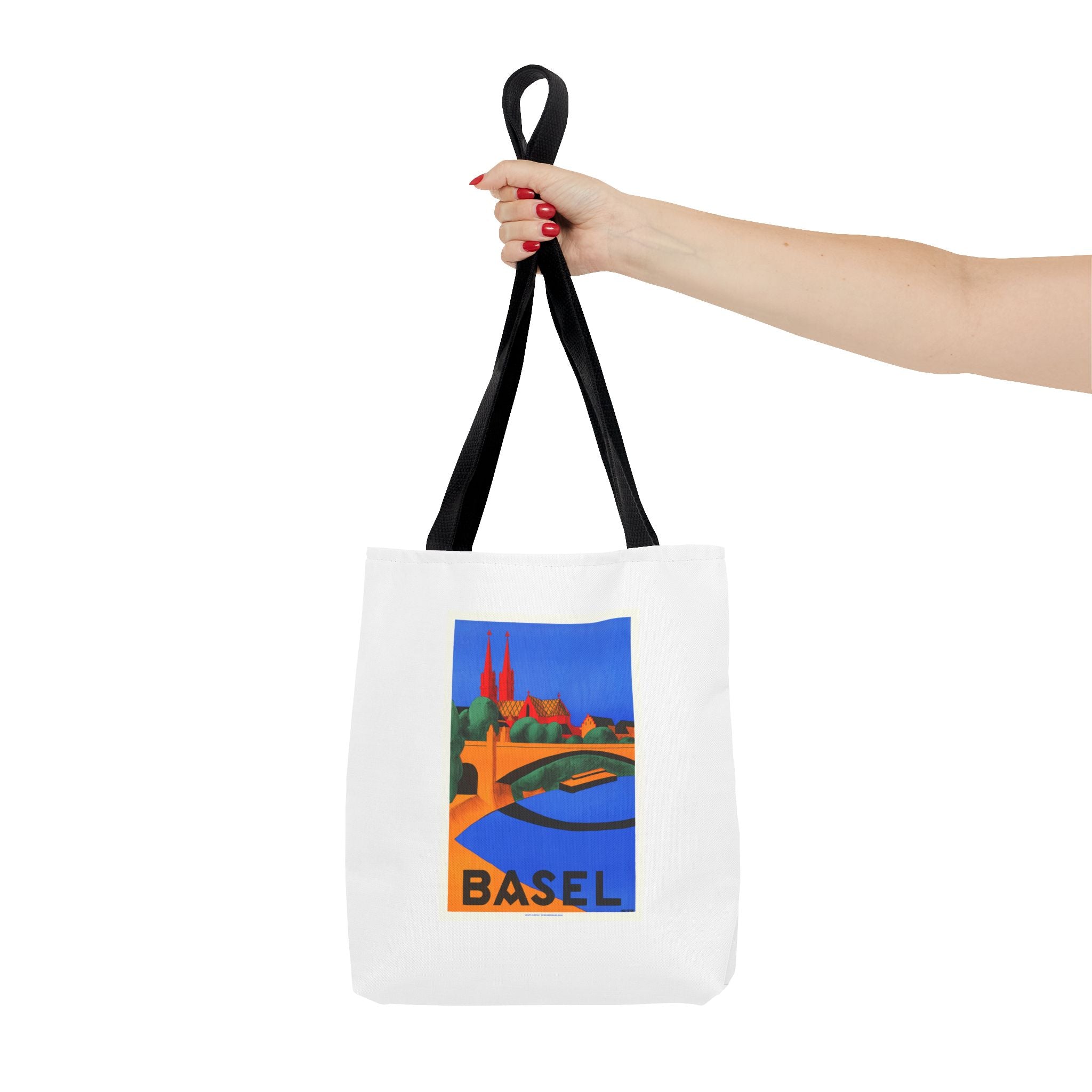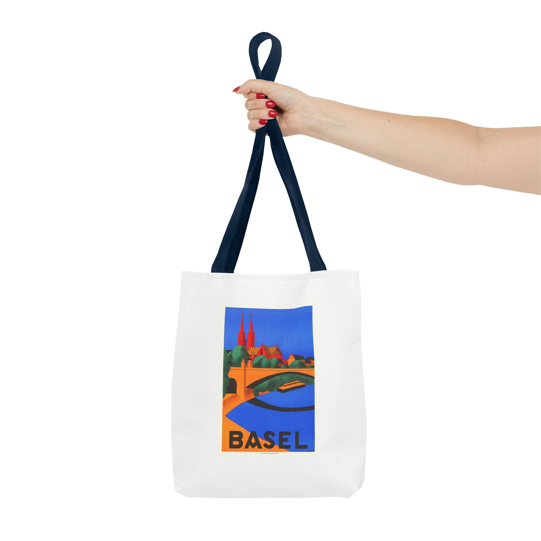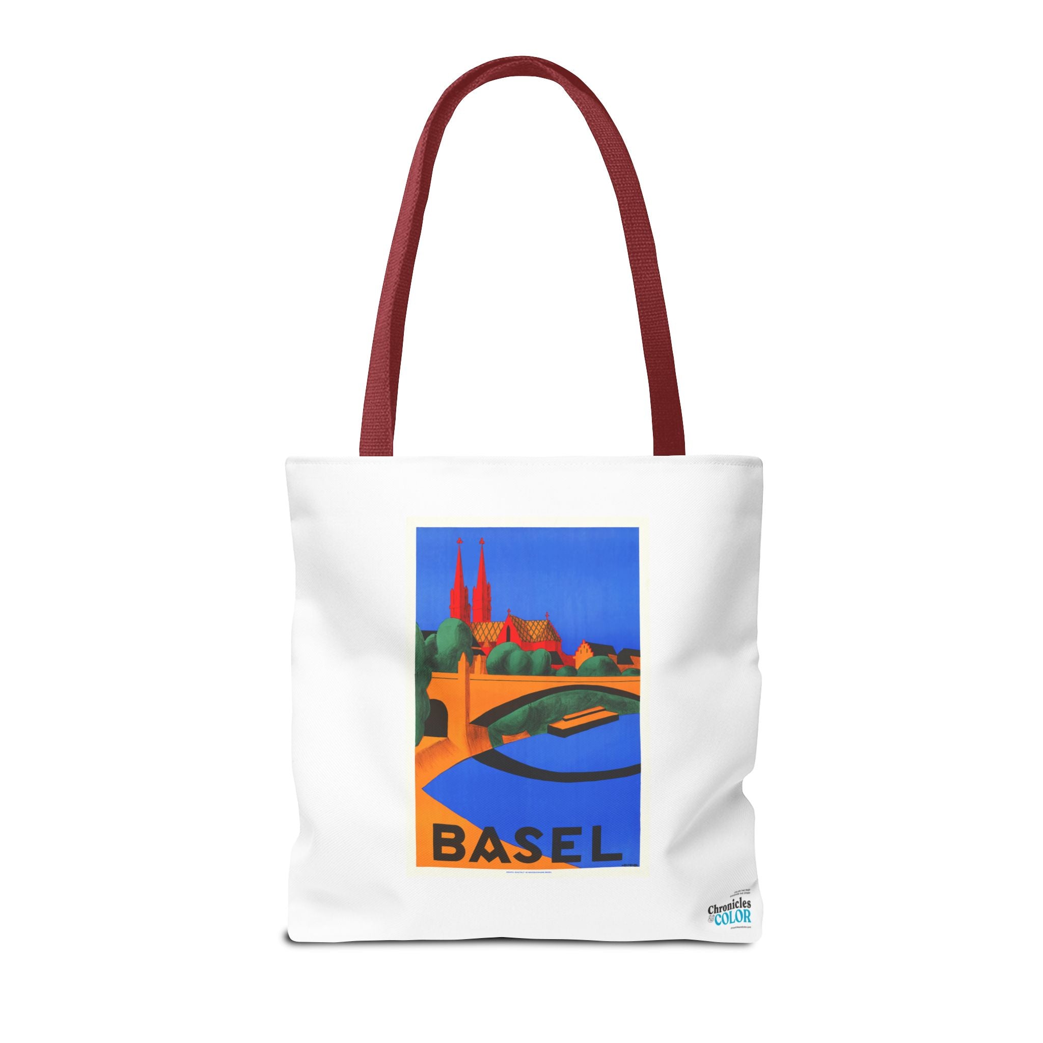 1927 lithograph by Hedwig Thoma captures Basel in bold color and clean shapes. The Rhine curves across the foreground toward the red-sandstone Basel Minster—its twin towers anchoring a skyline shaped by Romanesque roots and later Gothic rebuilds. Thoma’s simplified forms and strong contrasts reflect the Swiss poster-art style of the late 1920s, designed to catch the eye in bustling travel halls. The bridge hints at Basel’s life at the crossroads of Switzerland, France and Germany, where trade and culture mingle. This vintage artwork feels fresh and is perfect for lovers of travelers, vintatge art and European history.