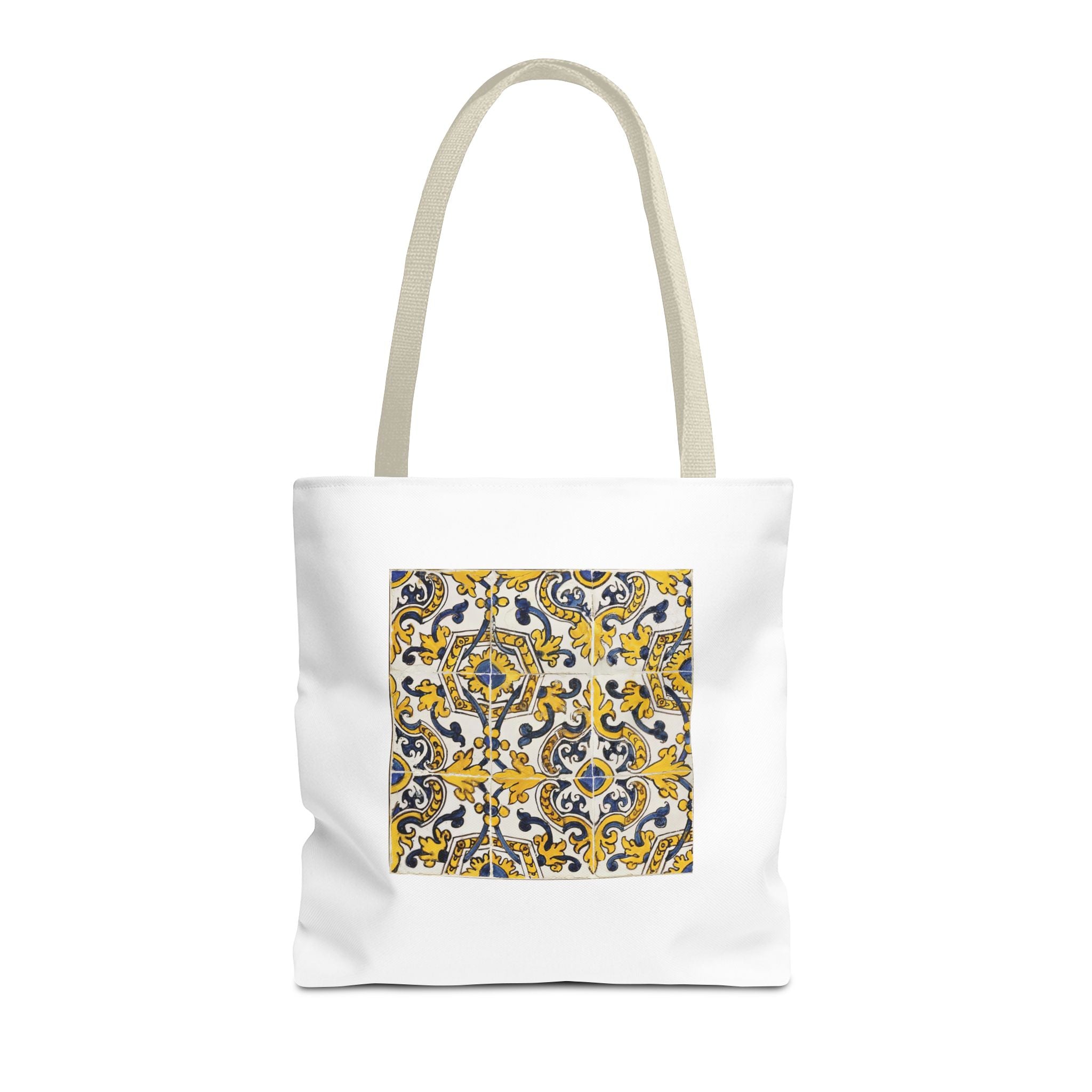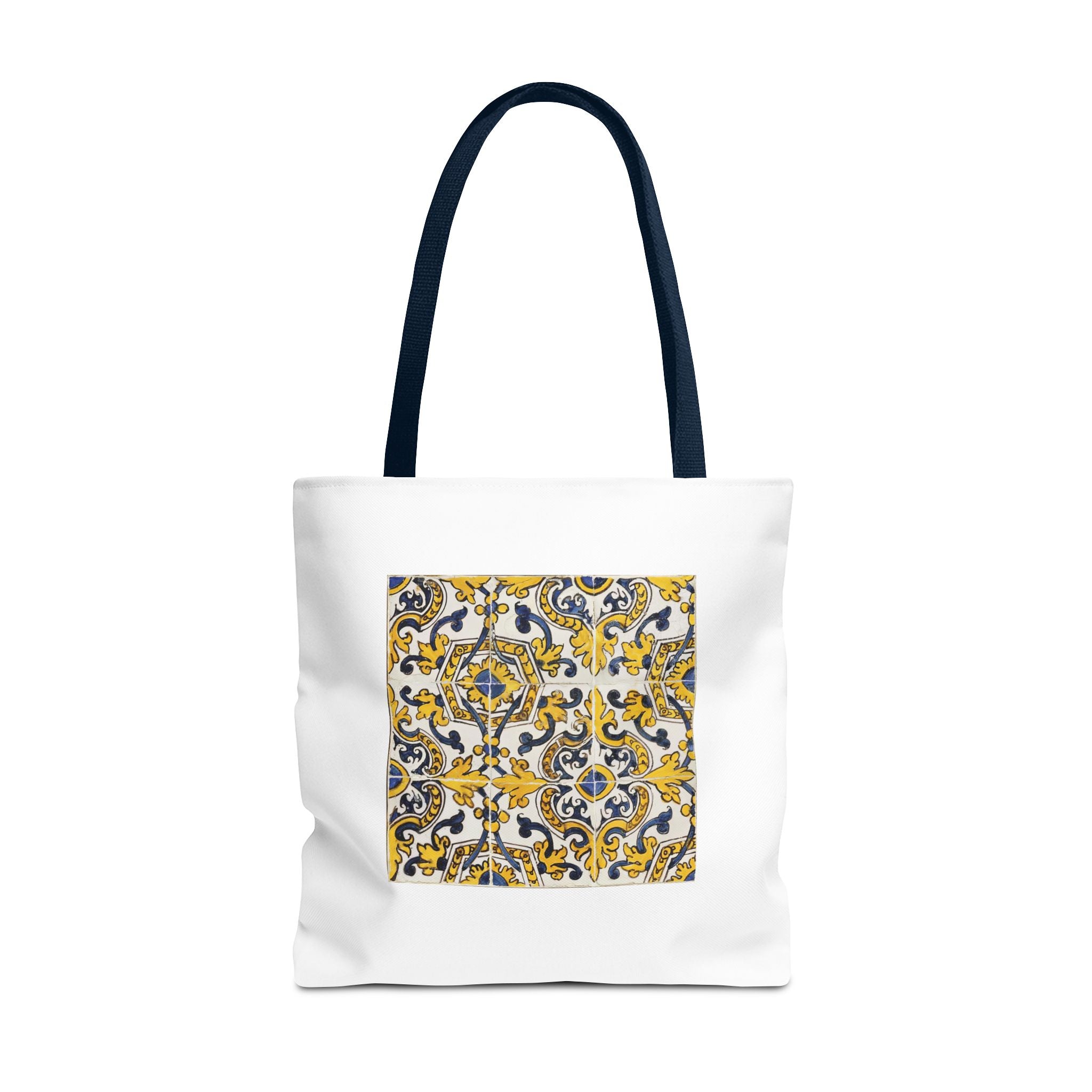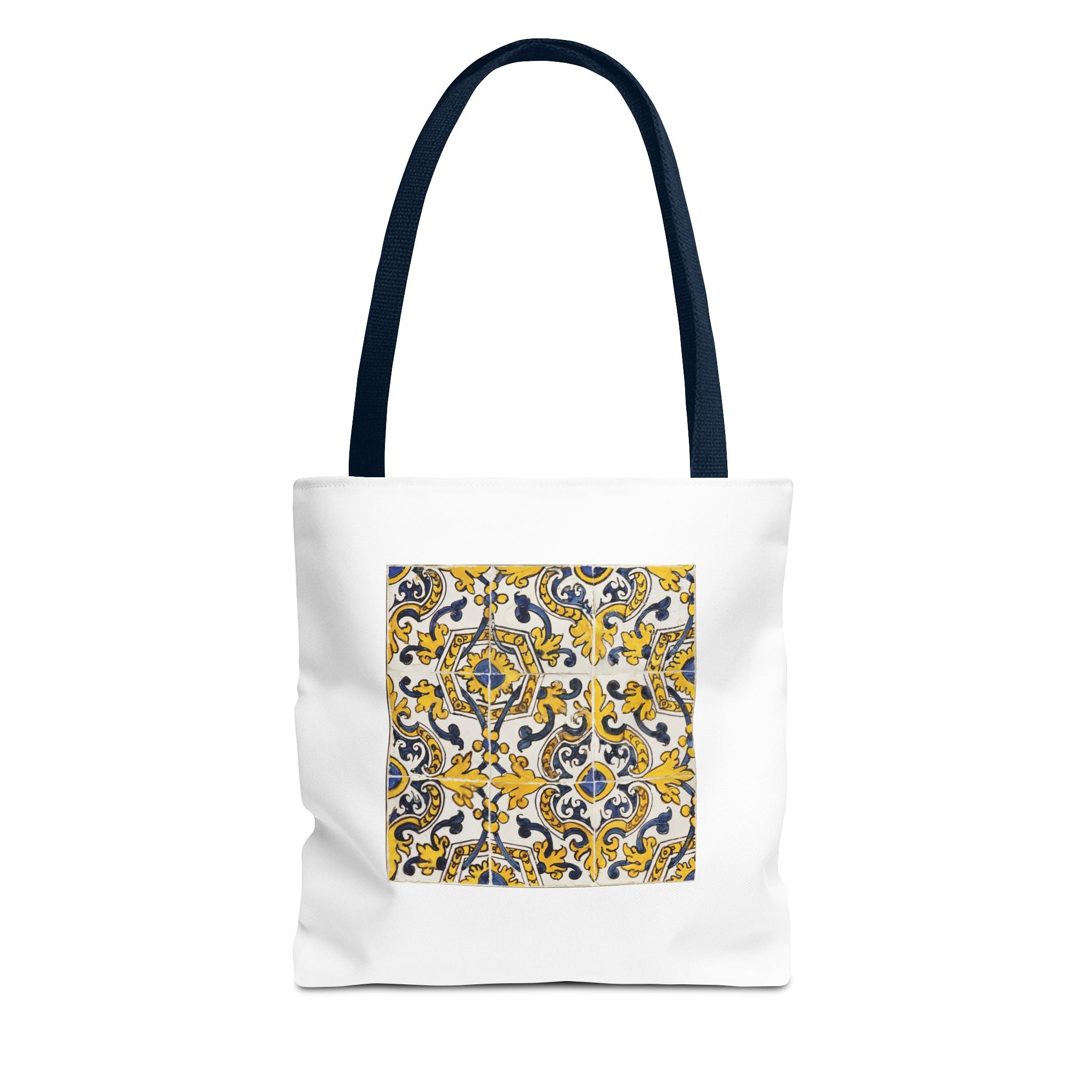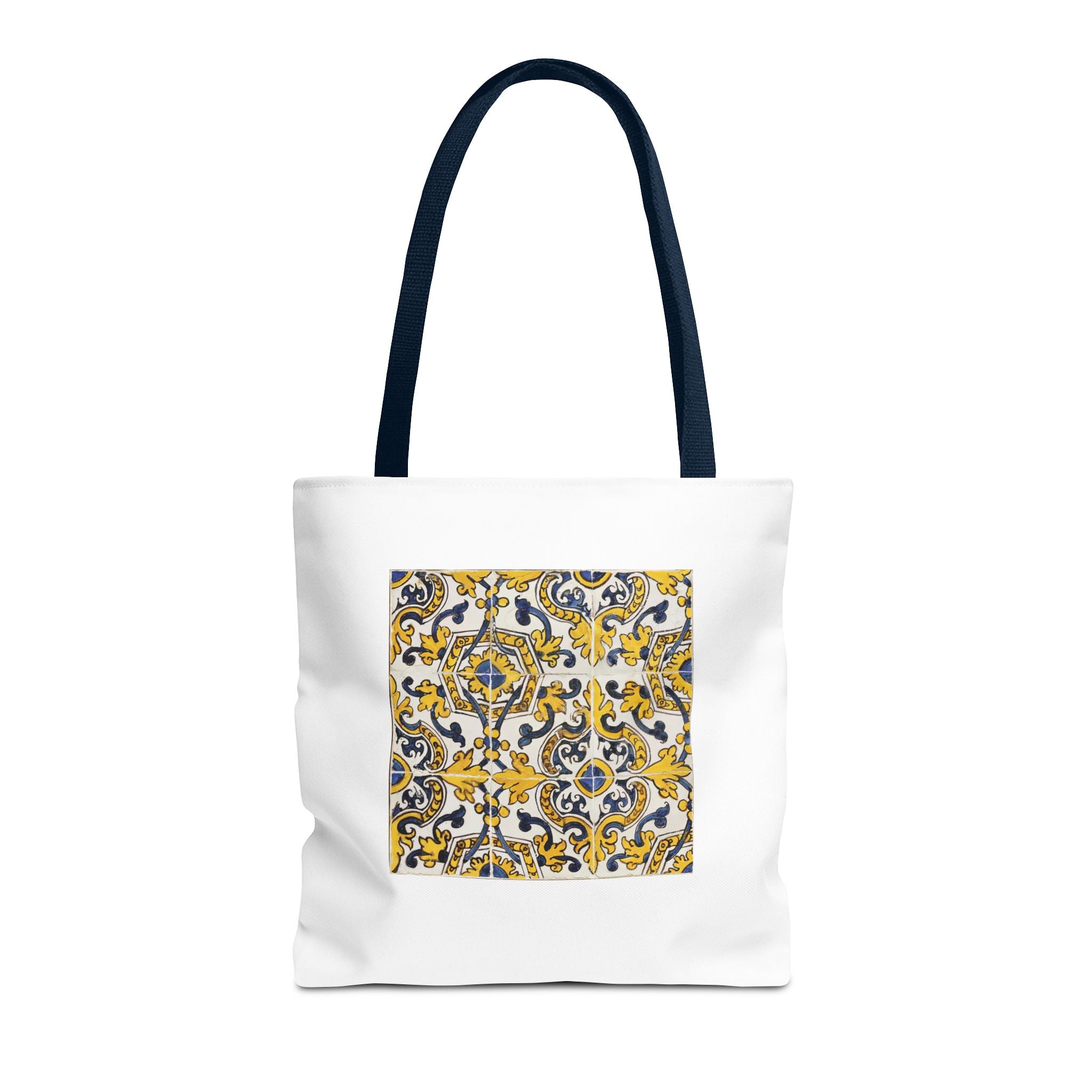 Celebrate the timeless beauty of Portuguese craftsmanship with this Vintage Portuguese Tile Tote Bag. Inspired by authentic 17th-century azulejos from the renowned Oficina de Lisboa (Lisbon Workshop), this design brings the spirit of old-world artistry into your living space. Hand-painted motifs in cobalt blue, golden yellow, and white create a seamless “tapete,” or carpet pattern, that reflects both balance and devotion. The intricate scrolls and floral flourishes echo Portugal’s Baroque elegance—where every brushstroke tells a story of patience, light, and cultural pride. Perfect for adding history and charm to your day.
