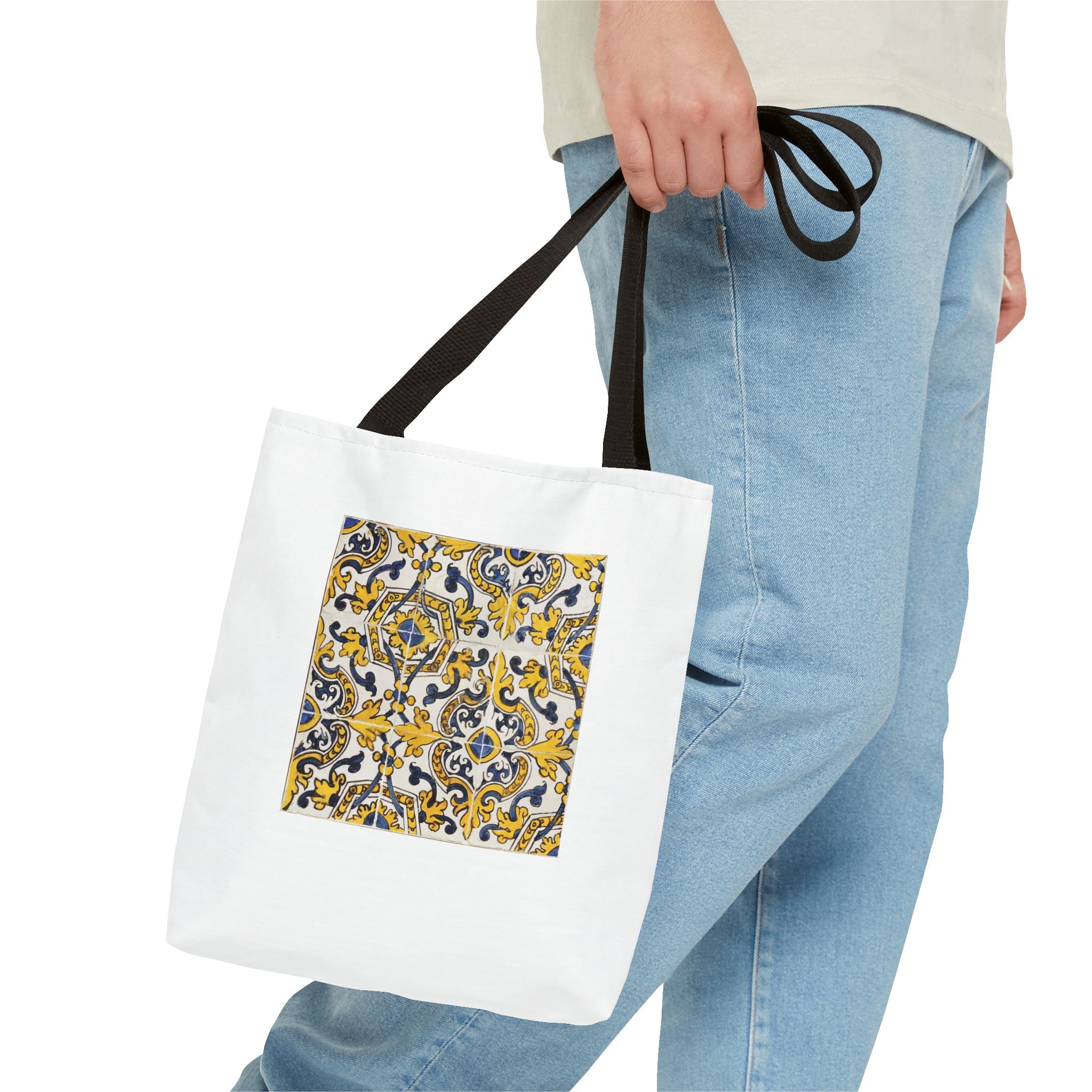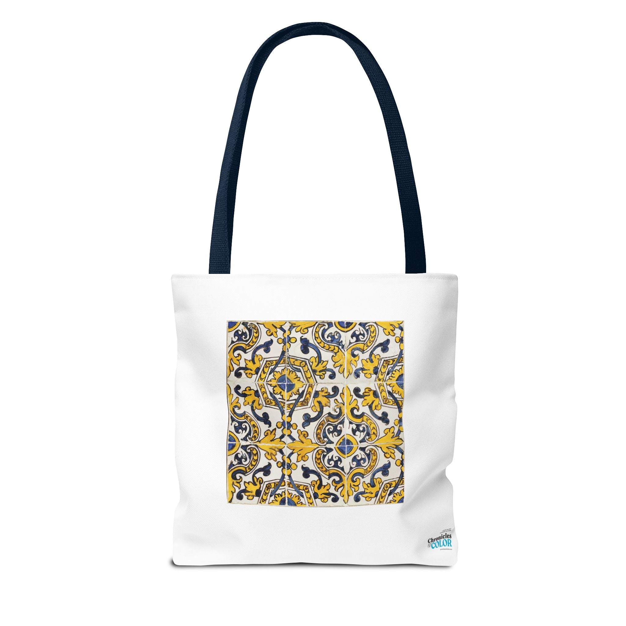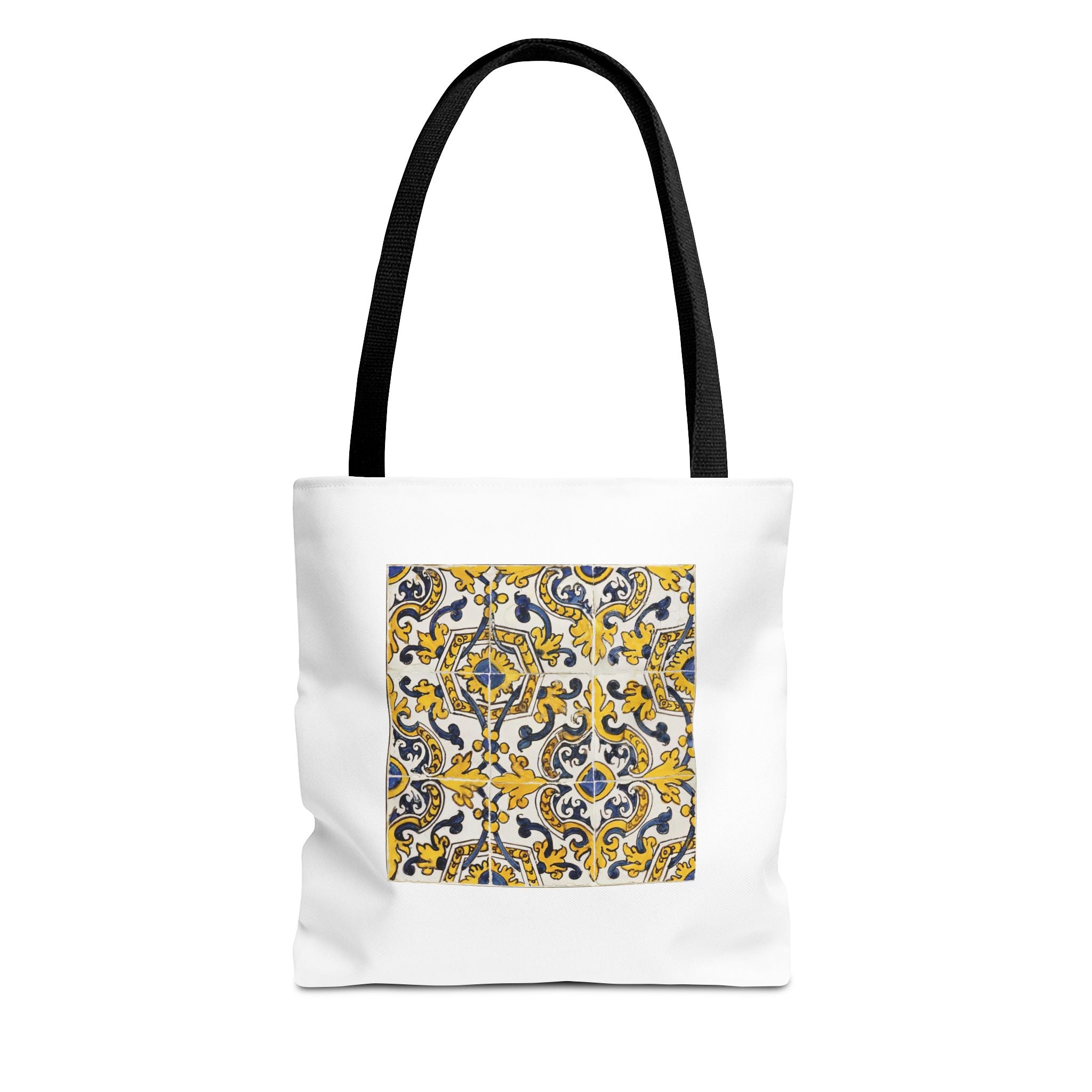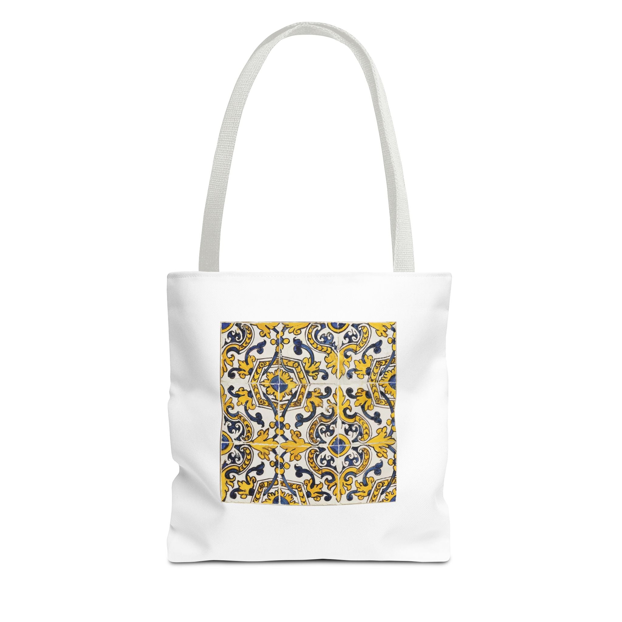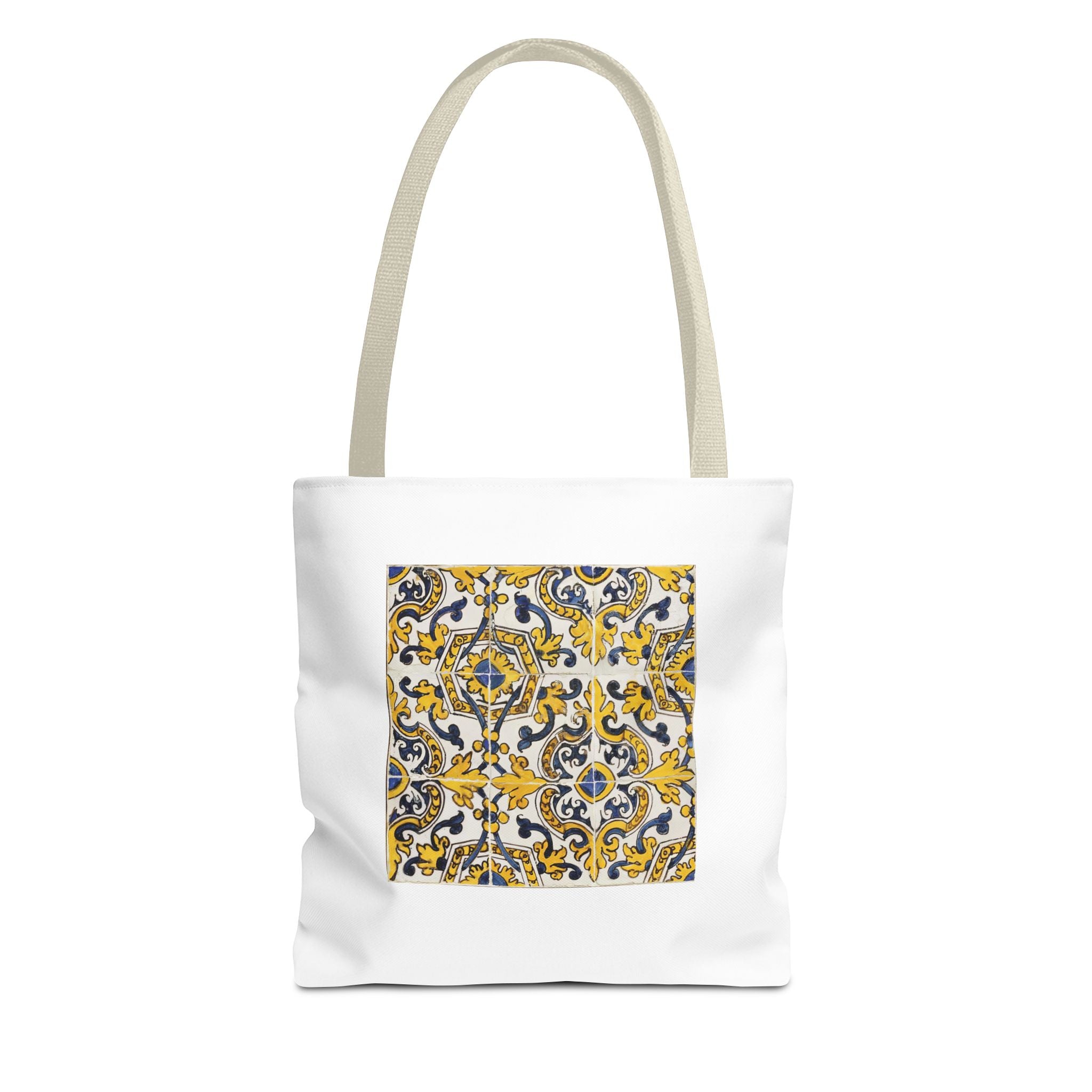 Celebrate the timeless beauty of Portuguese craftsmanship with this Vintage Portuguese Tile Tote Bag. Inspired by authentic 17th-century azulejos from the renowned Oficina de Lisboa (Lisbon Workshop), this design brings the spirit of old-world artistry into your living space. Hand-painted motifs in cobalt blue, golden yellow, and white create a seamless “tapete,” or carpet pattern, that reflects both balance and devotion. The intricate scrolls and floral flourishes echo Portugal’s Baroque elegance—where every brushstroke tells a story of patience, light, and cultural pride. Perfect for adding history and charm to your day.