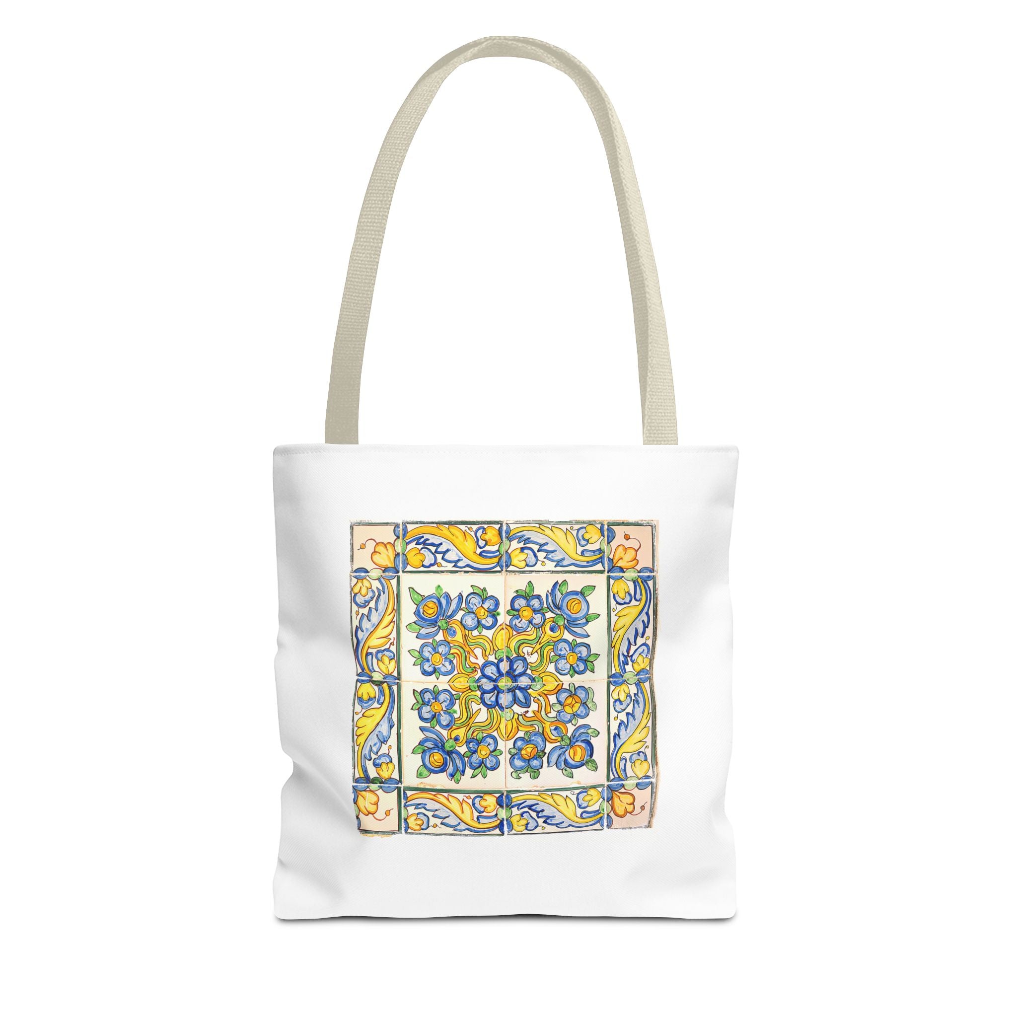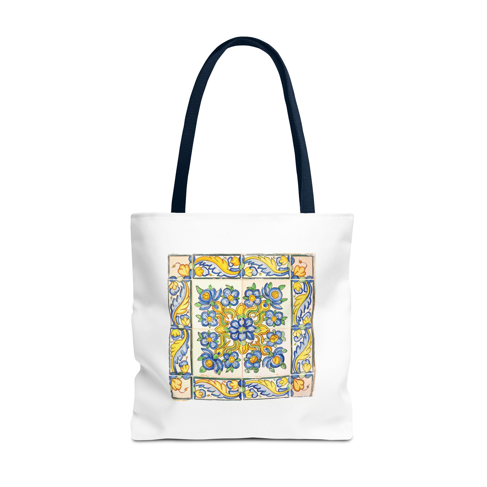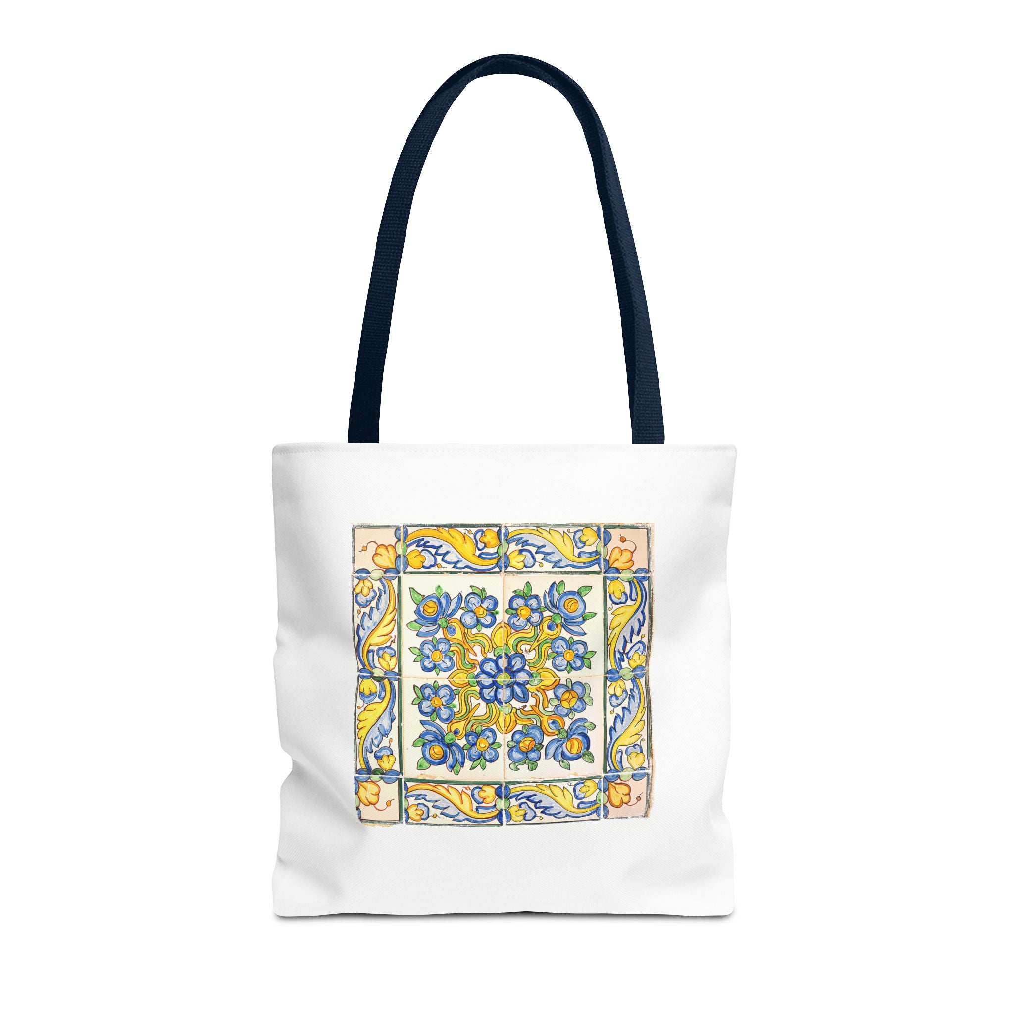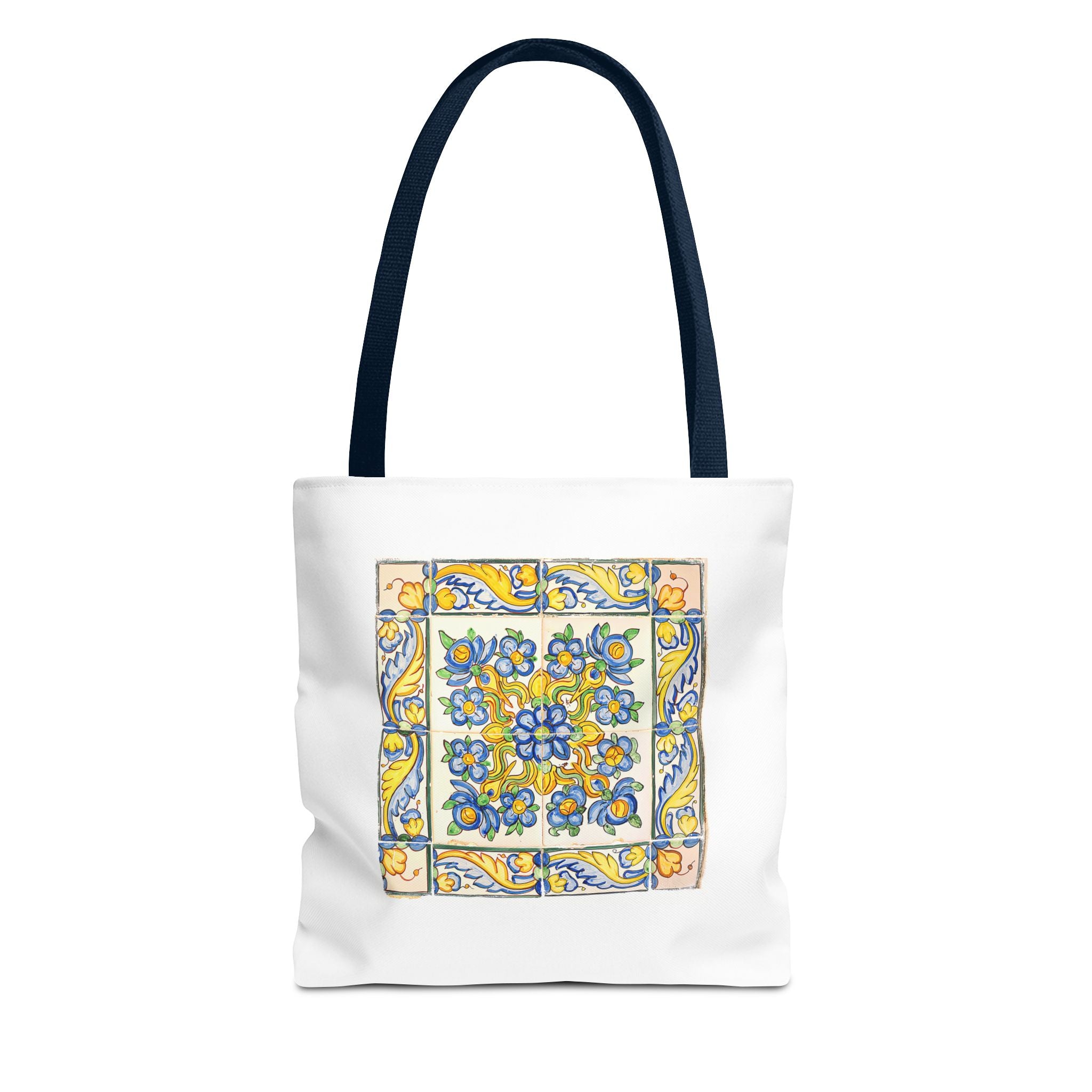 Celebrate the timeless beauty of Portuguese craftsmanship with this Vintage Yellow Floral Tile Pattern Tote Bag. Inspired by eighteenth-century azulejos, this design captures the graceful fusion of Baroque drama and Rococo elegance. Hand-painted motifs of curling vines and delicate blossoms evoke the artistry that once adorned palaces and cathedrals across Lisbon. The bright cobalt and golden hues dance across a radiant white glaze—a tribute to the tin-oxide technique that gave these ceramics their luminous charm. Perfect for adding a touch of historic warmth and European flair to your day.