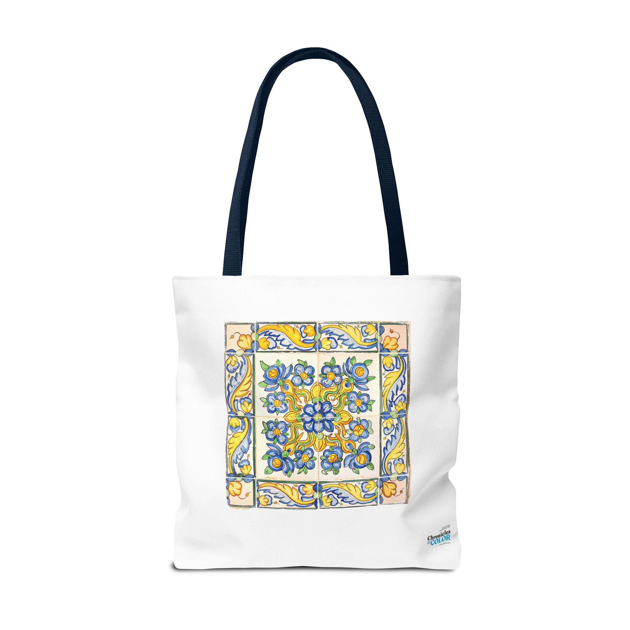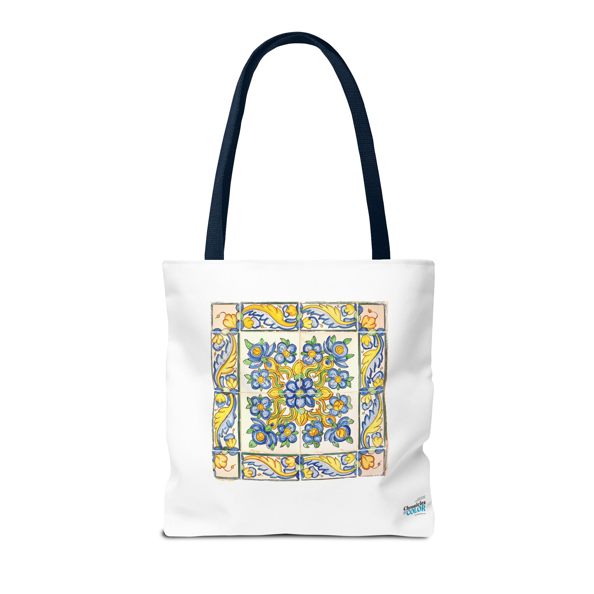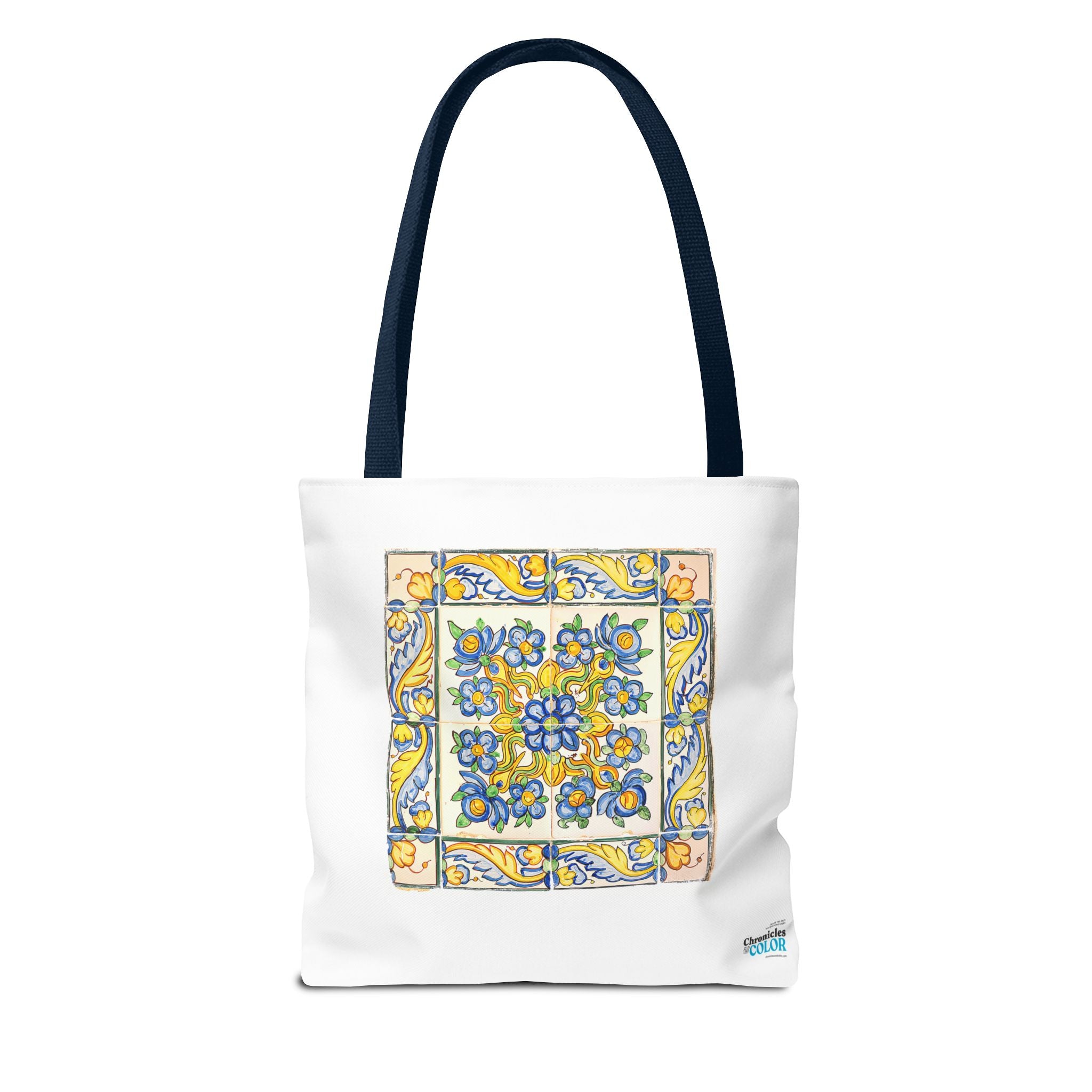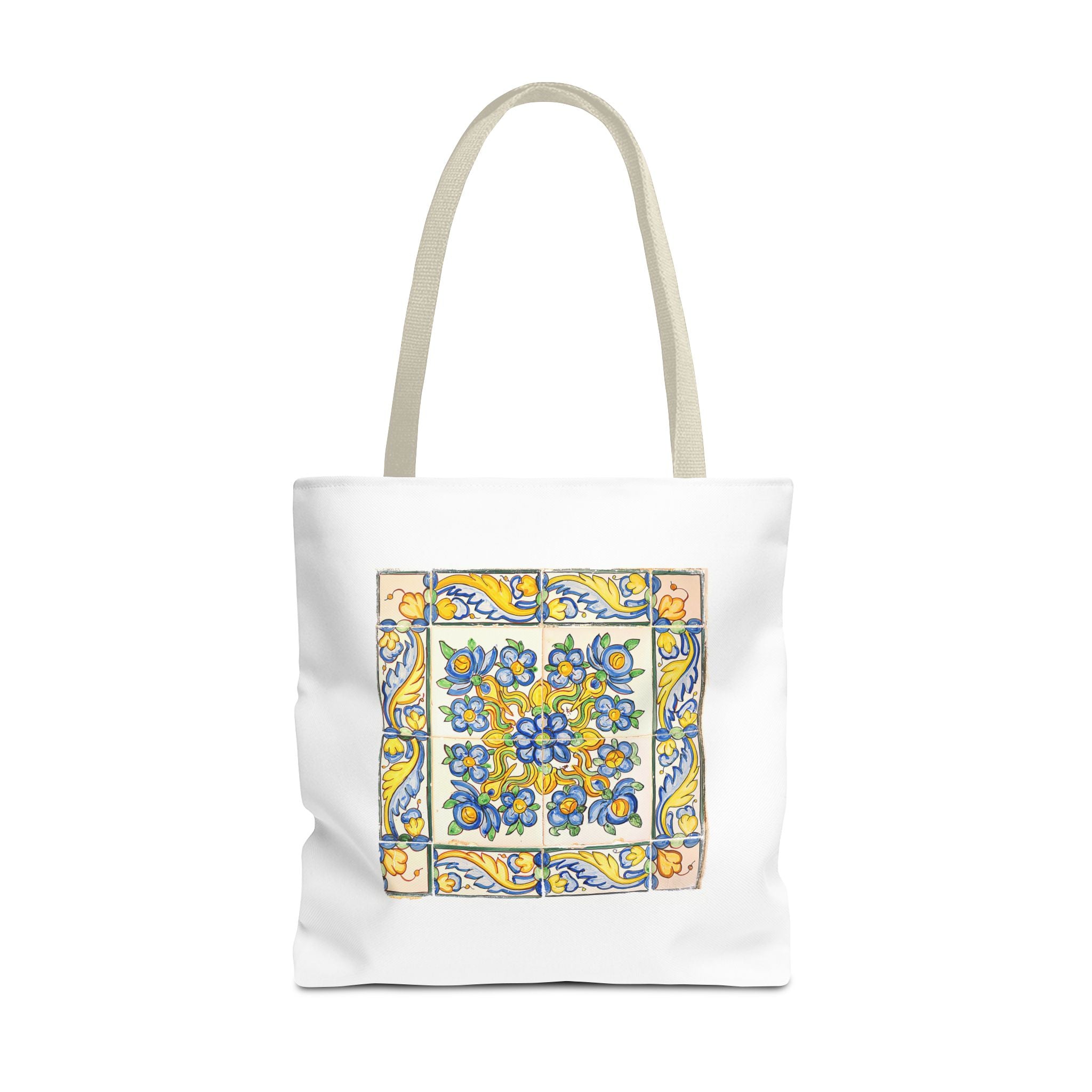 Celebrate the timeless beauty of Portuguese craftsmanship with this Vintage Yellow Floral Tile Pattern Tote Bag. Inspired by eighteenth-century azulejos, this design captures the graceful fusion of Baroque drama and Rococo elegance. Hand-painted motifs of curling vines and delicate blossoms evoke the artistry that once adorned palaces and cathedrals across Lisbon. The bright cobalt and golden hues dance across a radiant white glaze—a tribute to the tin-oxide technique that gave these ceramics their luminous charm. Perfect for adding a touch of historic warmth and European flair to your day.